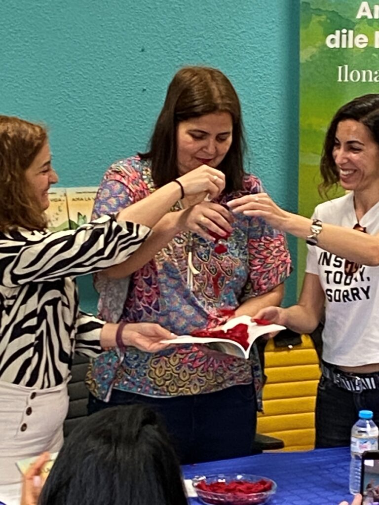 Marisol Jiménez De La Fuente (psicòloga del EASC Moncloa-Aravaca), qui va acompanyar a Ilona setmana rere setmana en el procés d’escriptura i sanació. Juntes, sobre el llibre, deixem caure pètals de rosa, segellant així l’inici d’aquesta nova etapa.
